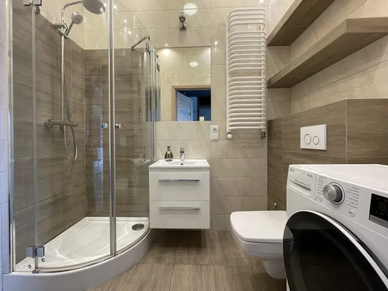 The rental price includes a dishwasher, a modern washing machine, a large fridge and freezer, a full-size oven, a 4-burner induction hob, a bagless vacuum cleaner, a vileda mop, an ironing board and a laundry dryer. The apartment has two spacious high wardrobes, spacious shelves in an integrated TV cabinet and in the sofa there is a storage space for bedding.