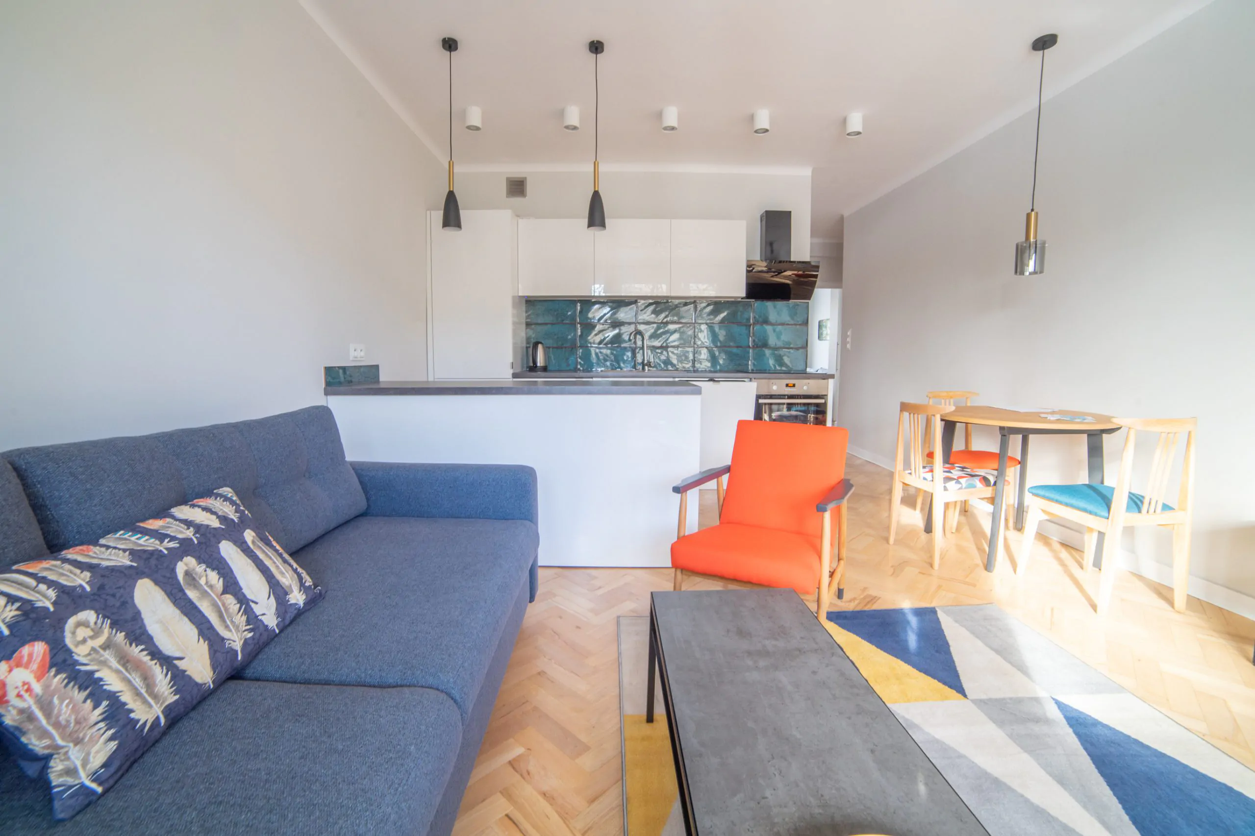 Powierzchnia mieszkalna wynosi 51,38 m2, na której zaaranżowano: dwie sypialnie, salon połączony z aneksem kuchennym wyposażony w pełny sprzęt AGD wraz ze zmywarka i pełnowymiarową lodówka i zamrażarką, pralką oraz łazienkę z prysznicem, przedpokój z szafą i balkon. Brak gazu w mieszkaniu.